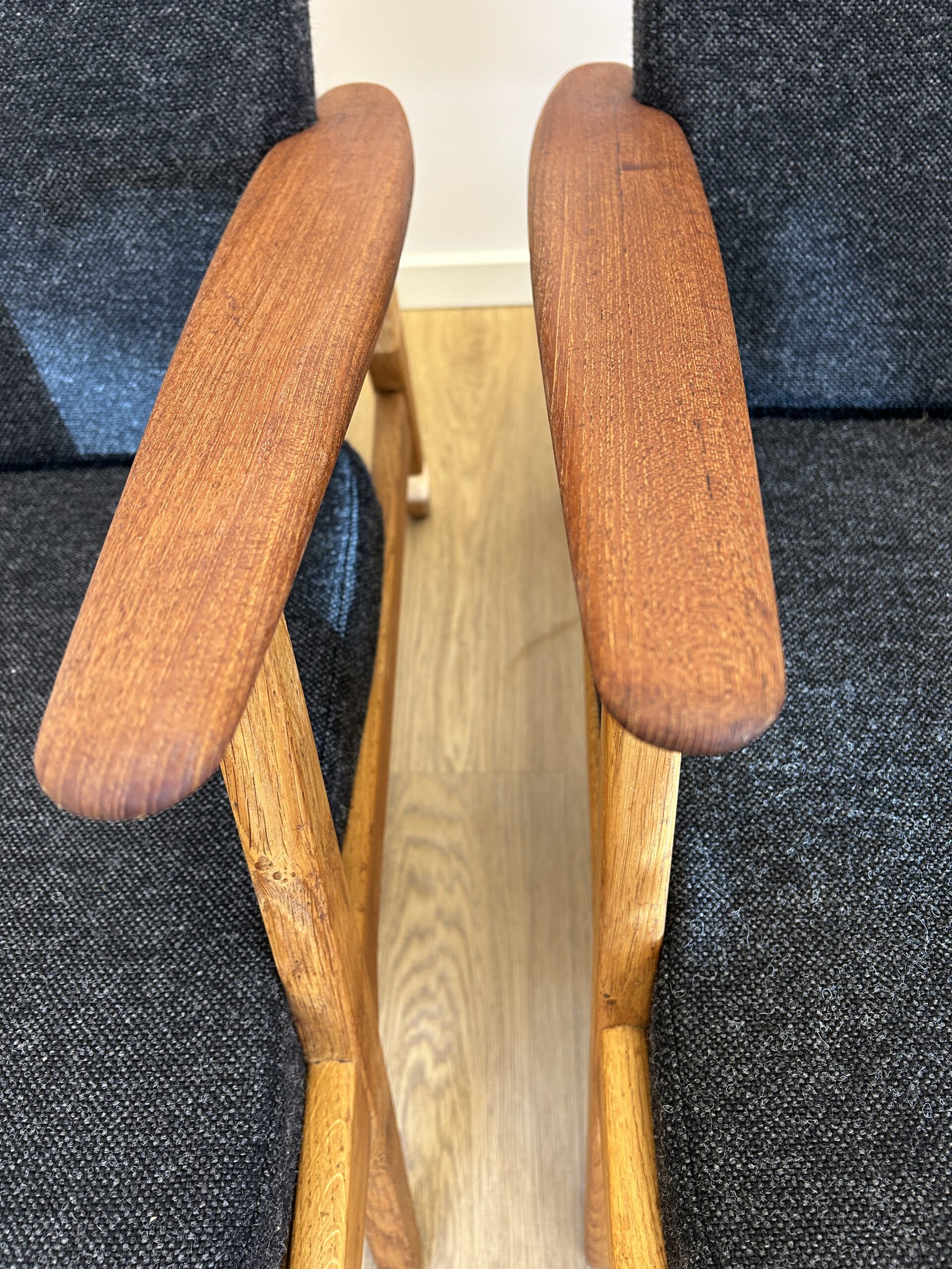 Stolene er fra 1960’erne og fremstår med elegante armlæn i teak og et massivt understel i eg, der giver et harmonisk og eksklusivt udtryk.