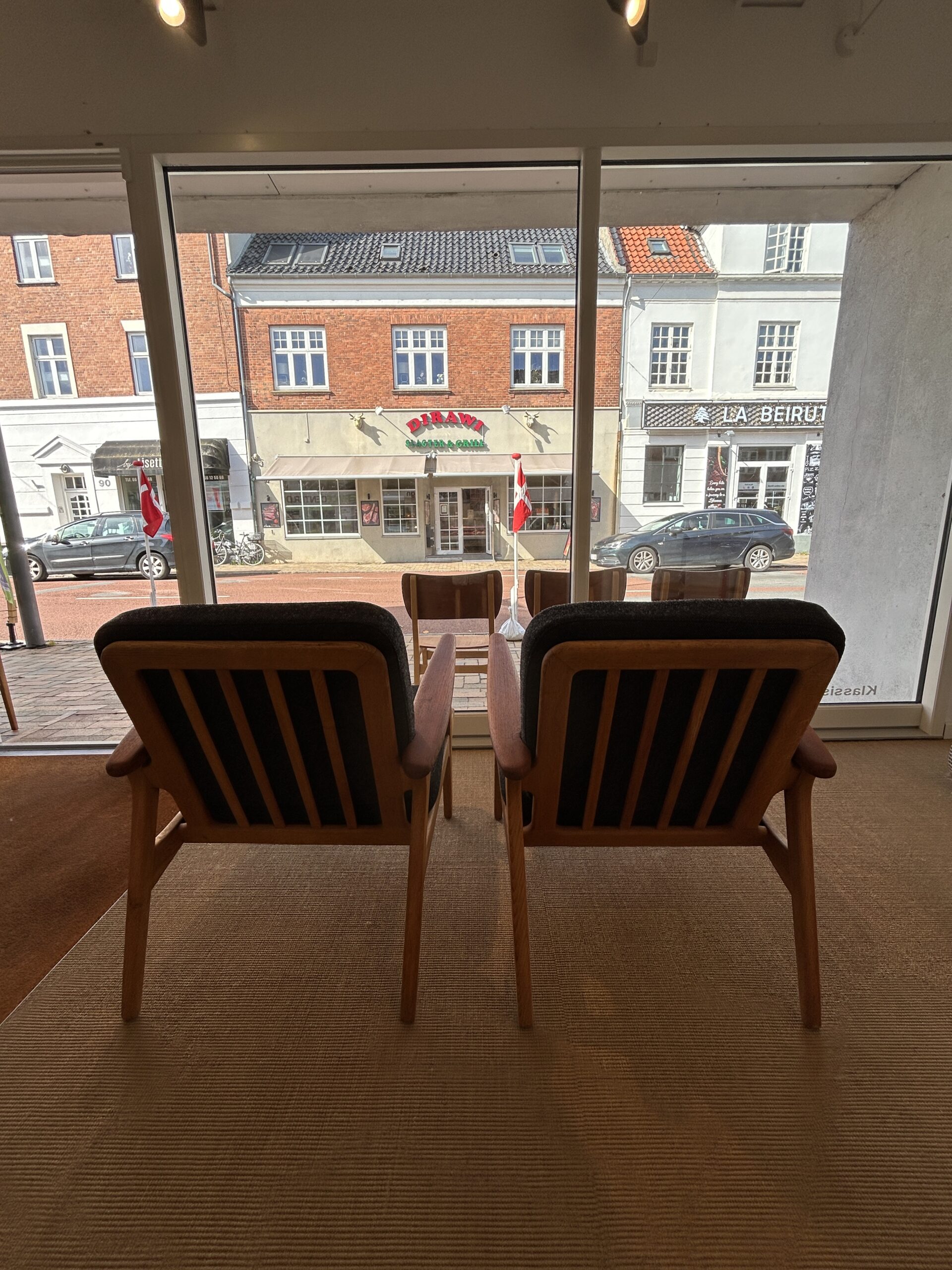 Begge stole er udstyret med nye hynder i koksfarvet Hallingdal-uld, et eksklusivt og slidstærkt tekstil, der tilfører et moderne, roligt udtryk.
