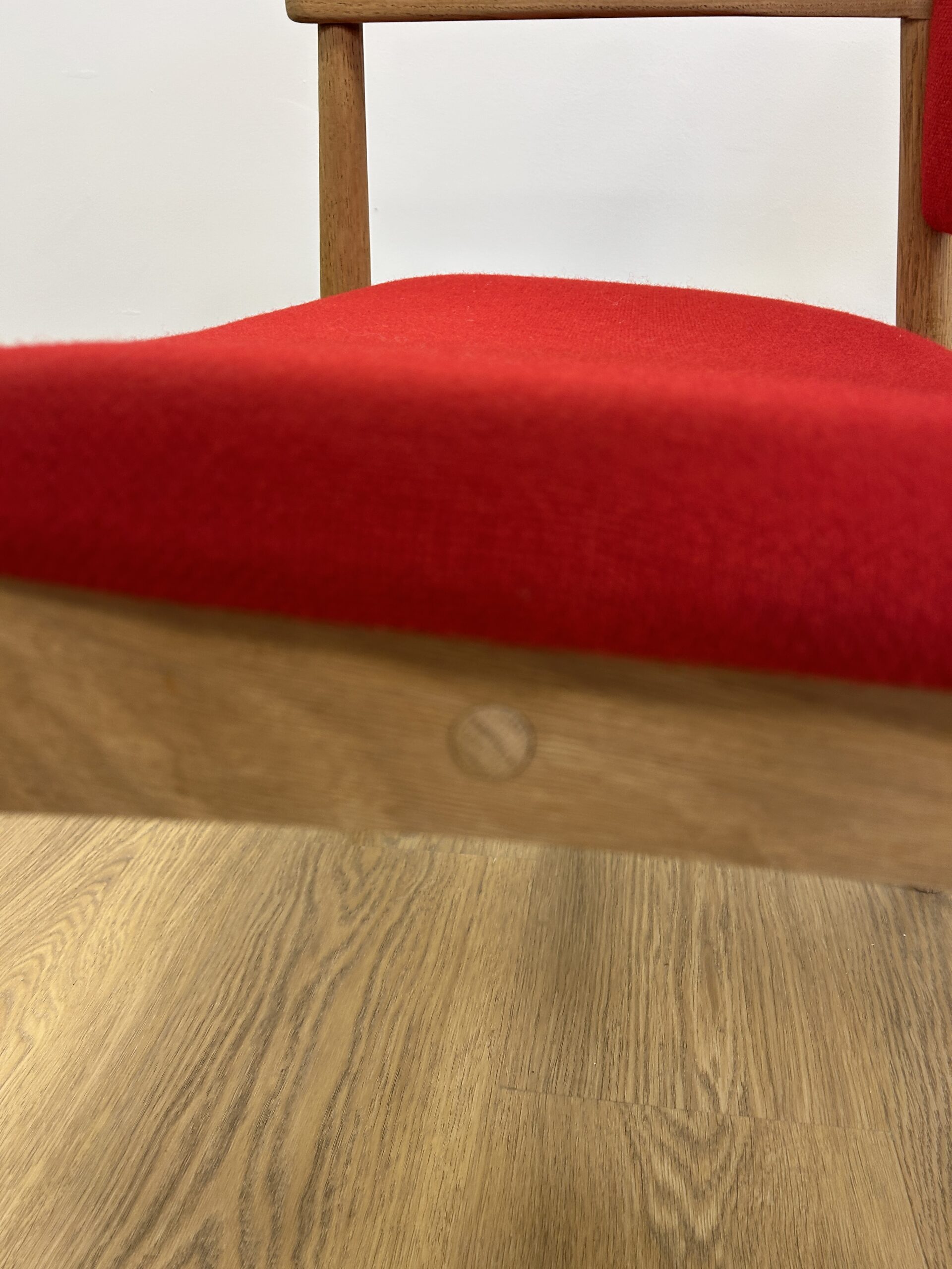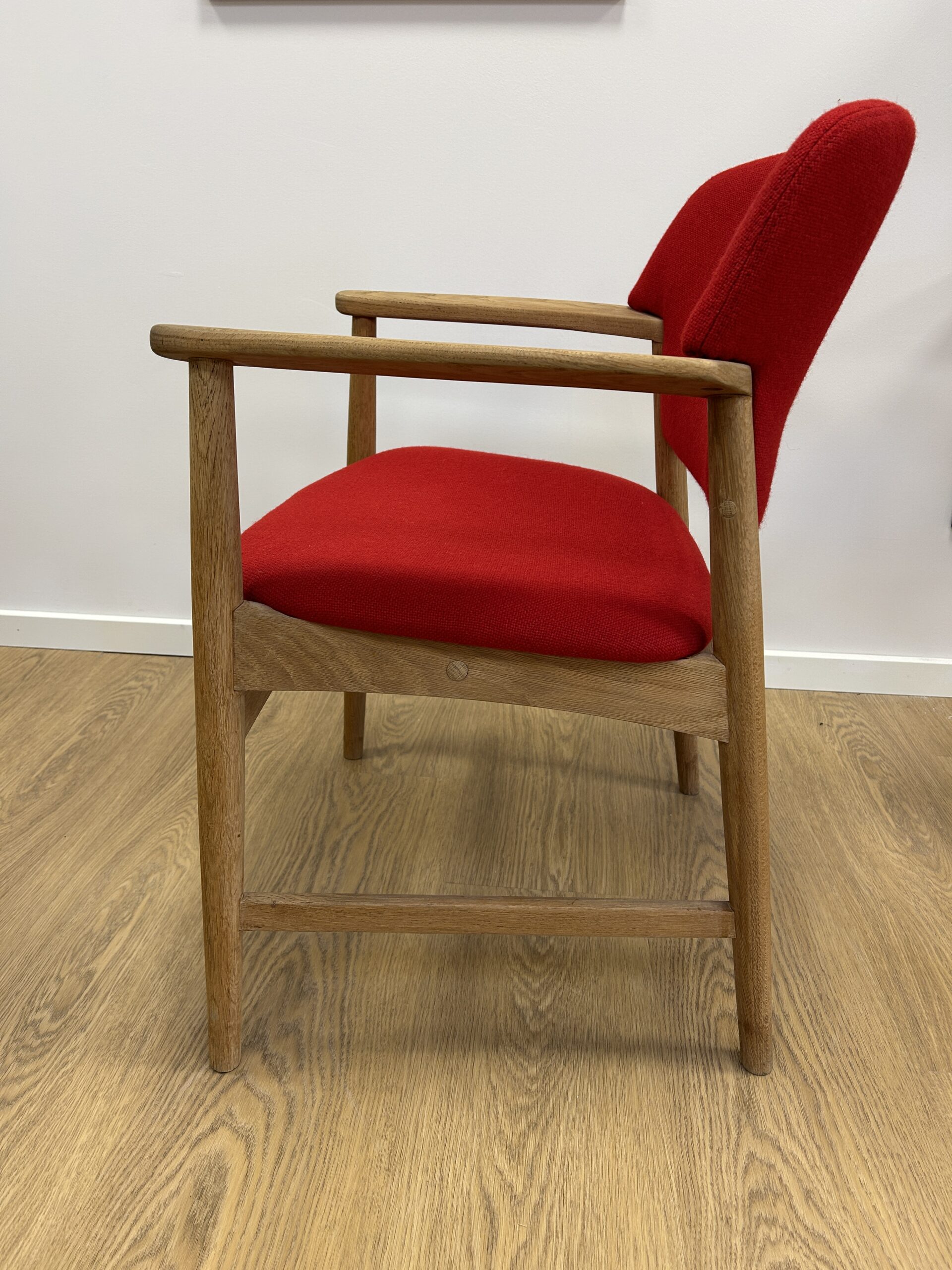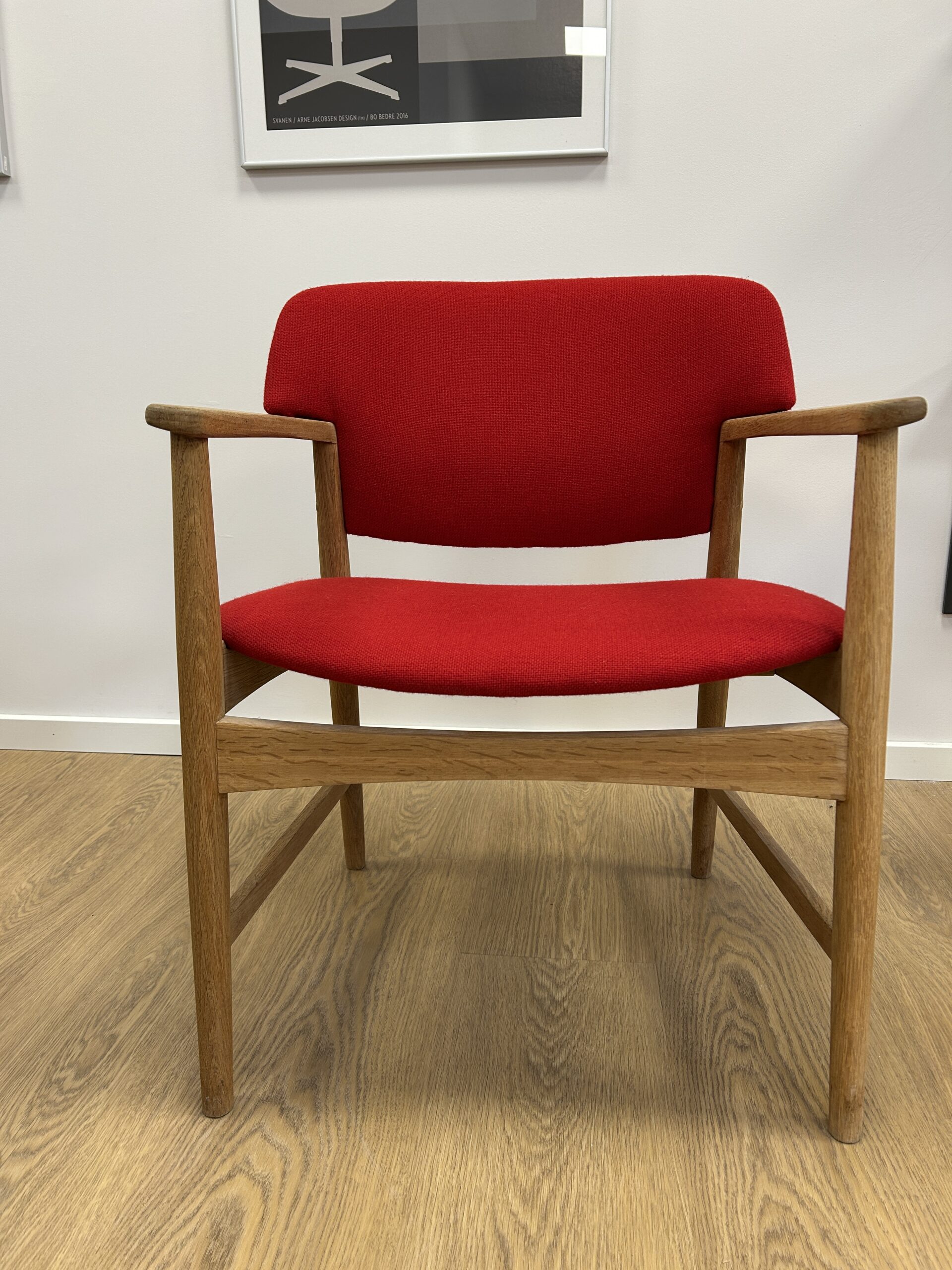 Stolen fremstår i meget flot stand – med nyt skum og eksklusiv polstring i rødt Hallingdal uld.