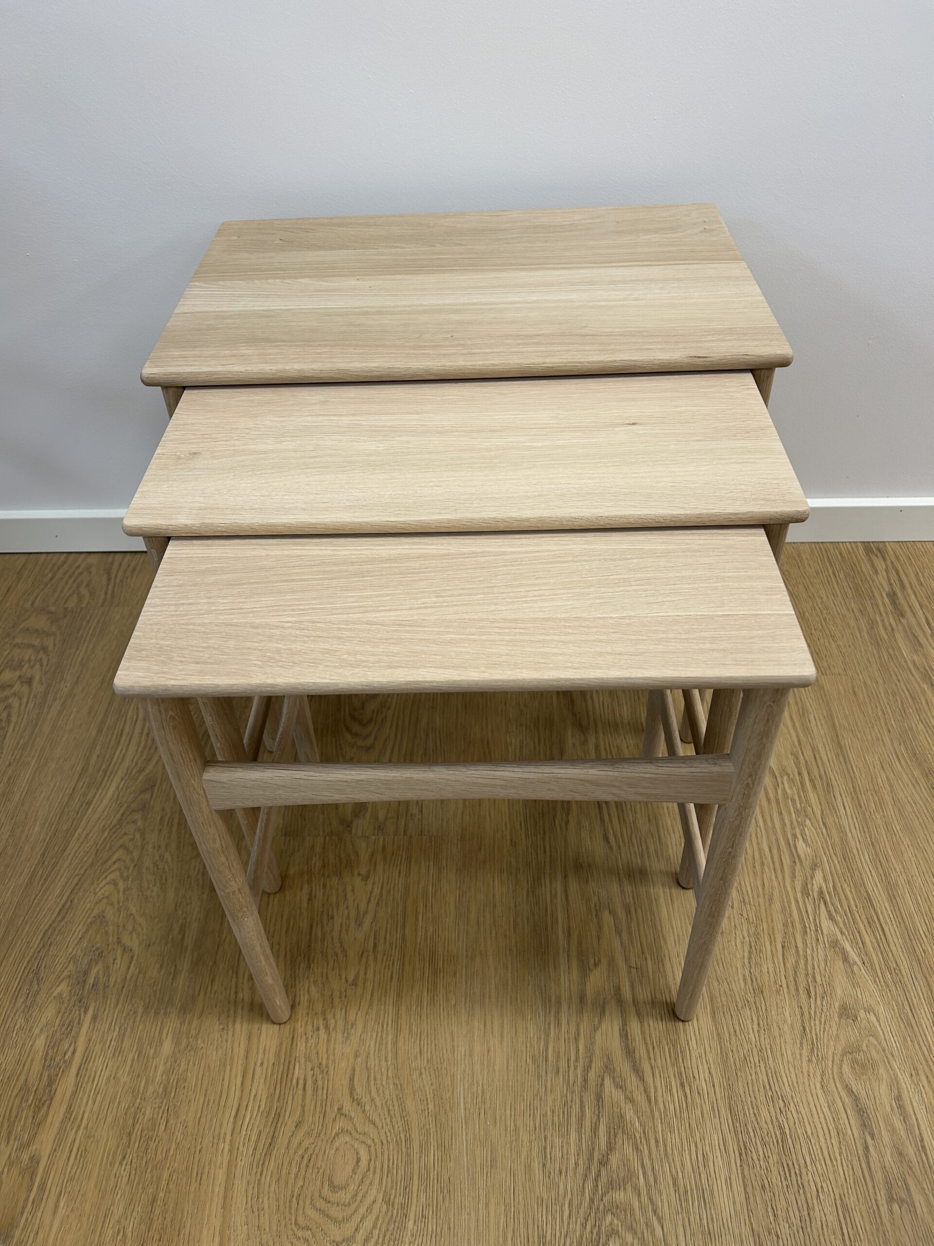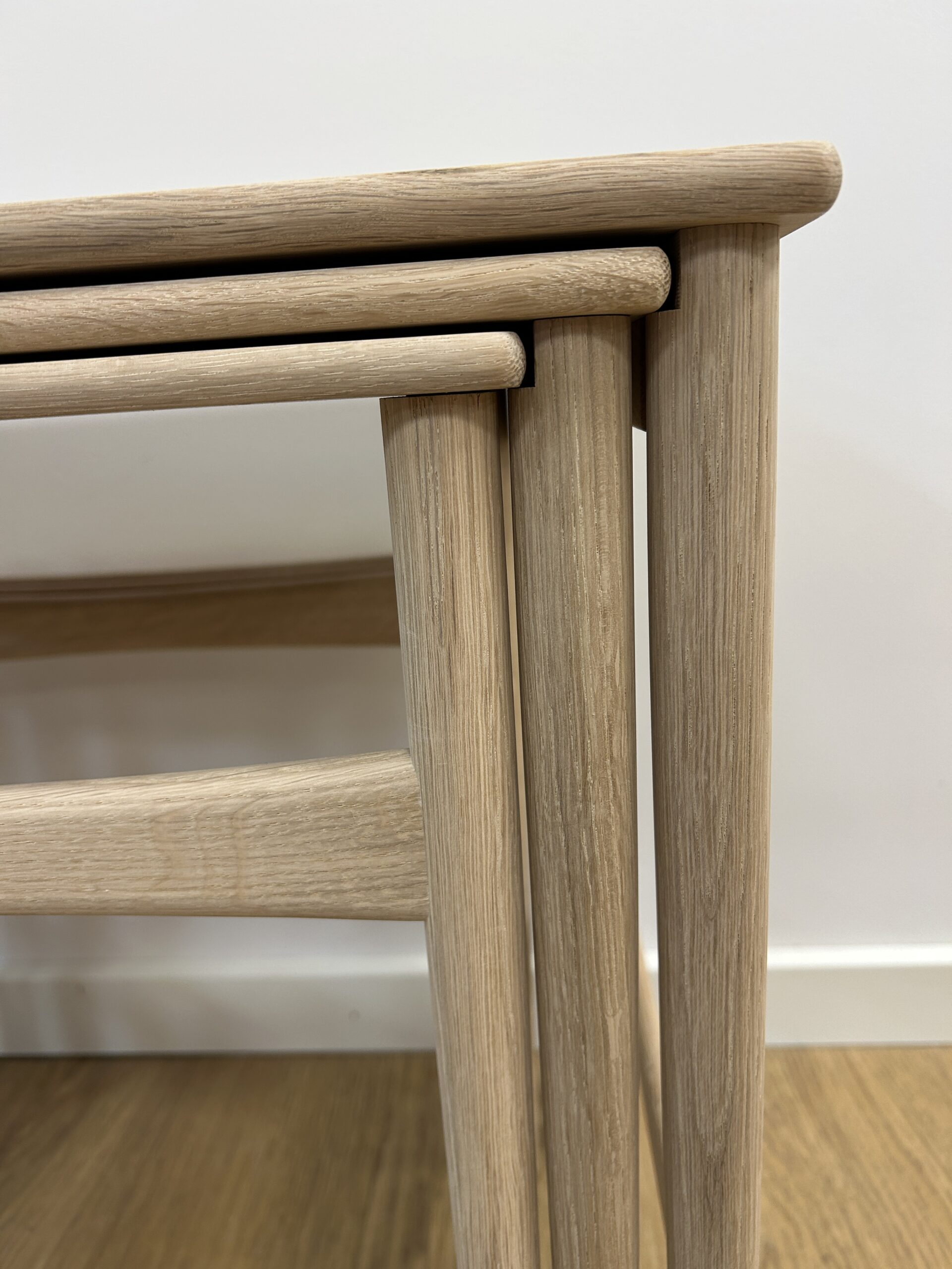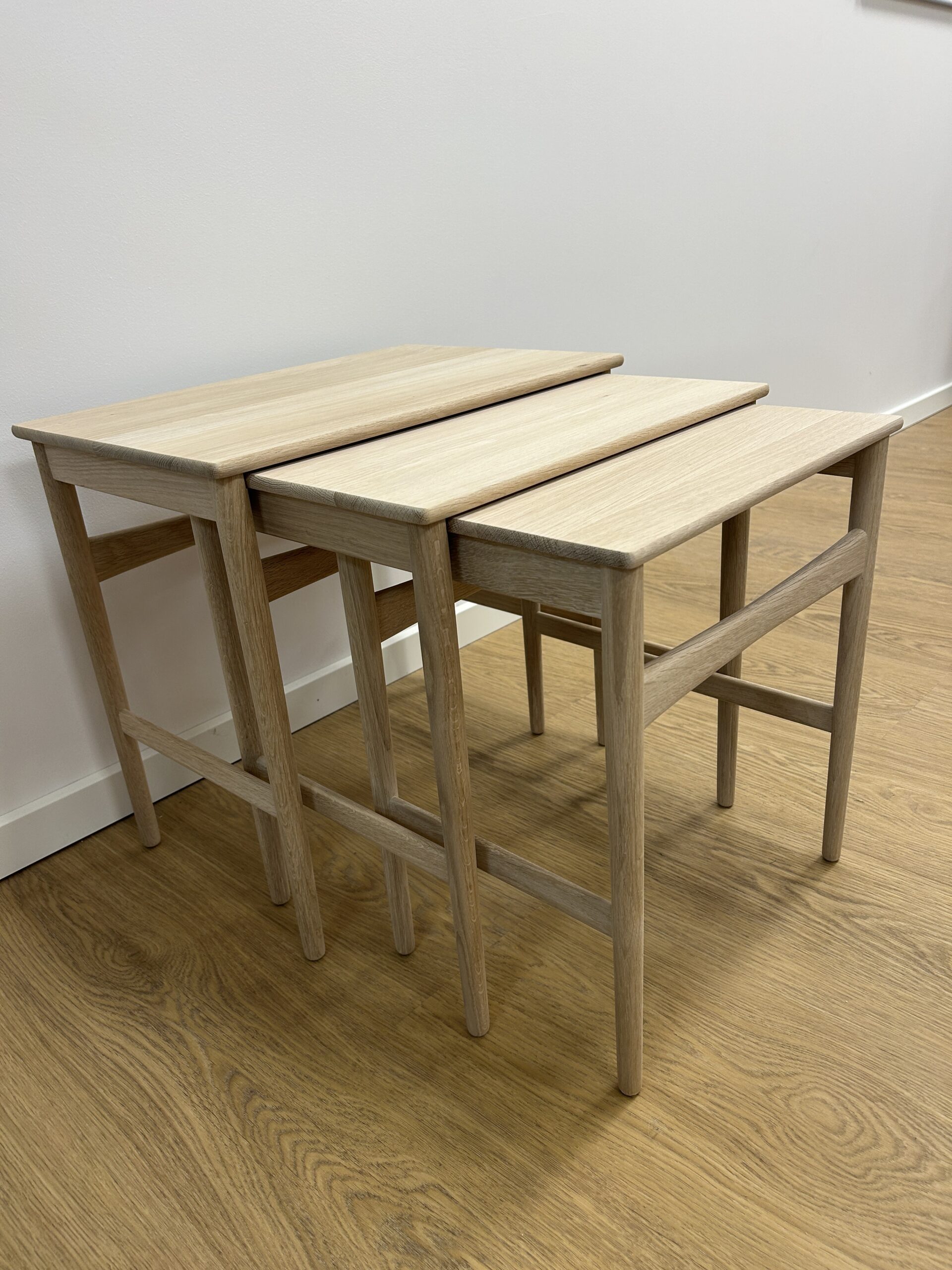 Sættet består af tre indskudsborde udført i massiv sæbebehandlet eg, som fremhæver træets naturlige struktur og giver en varm, mat overflade.