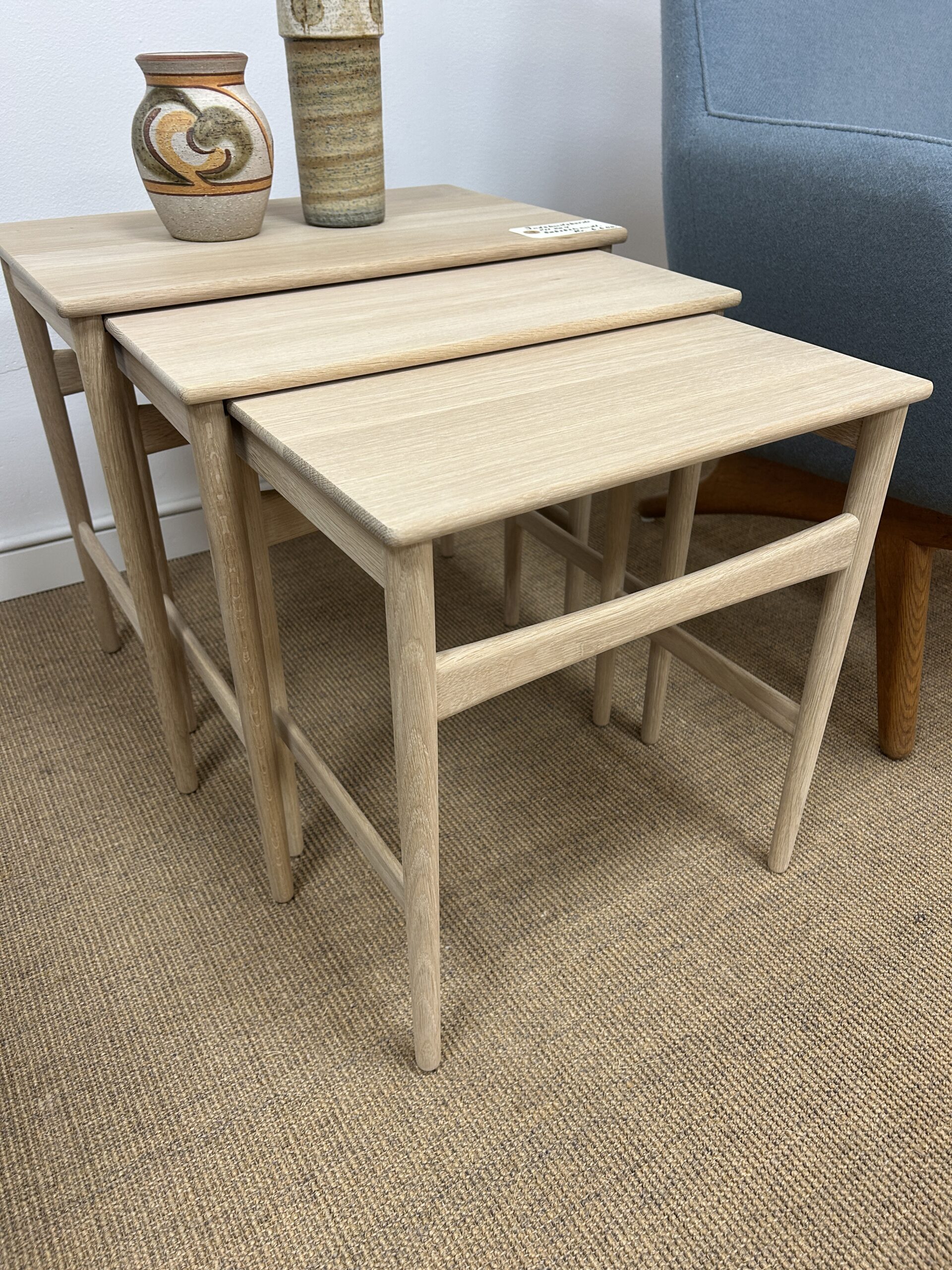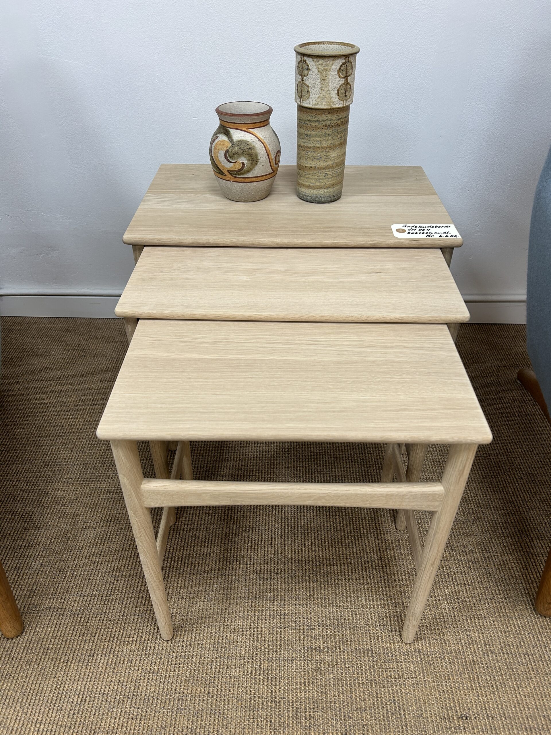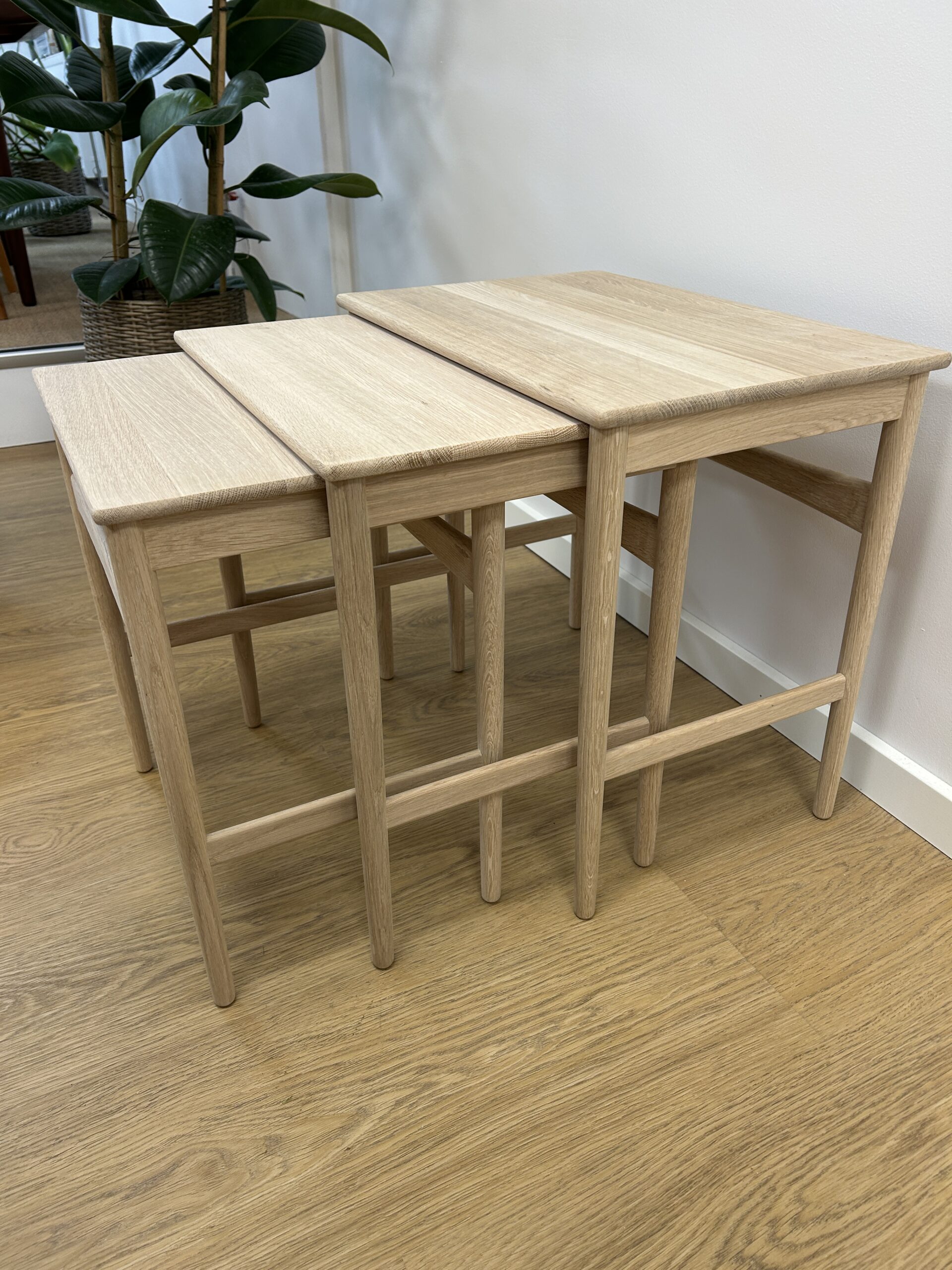 Sættet består af tre indskudsborde udført i massiv sæbebehandlet eg, som fremhæver træets naturlige struktur og giver en varm, mat overflade.