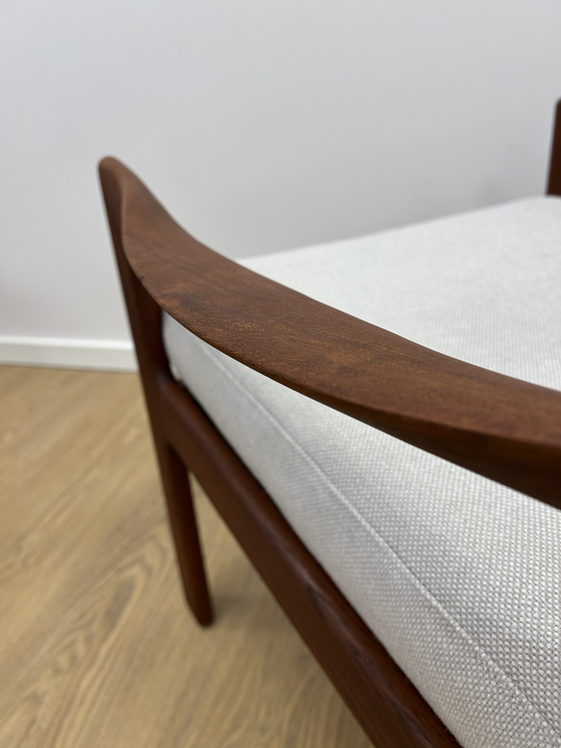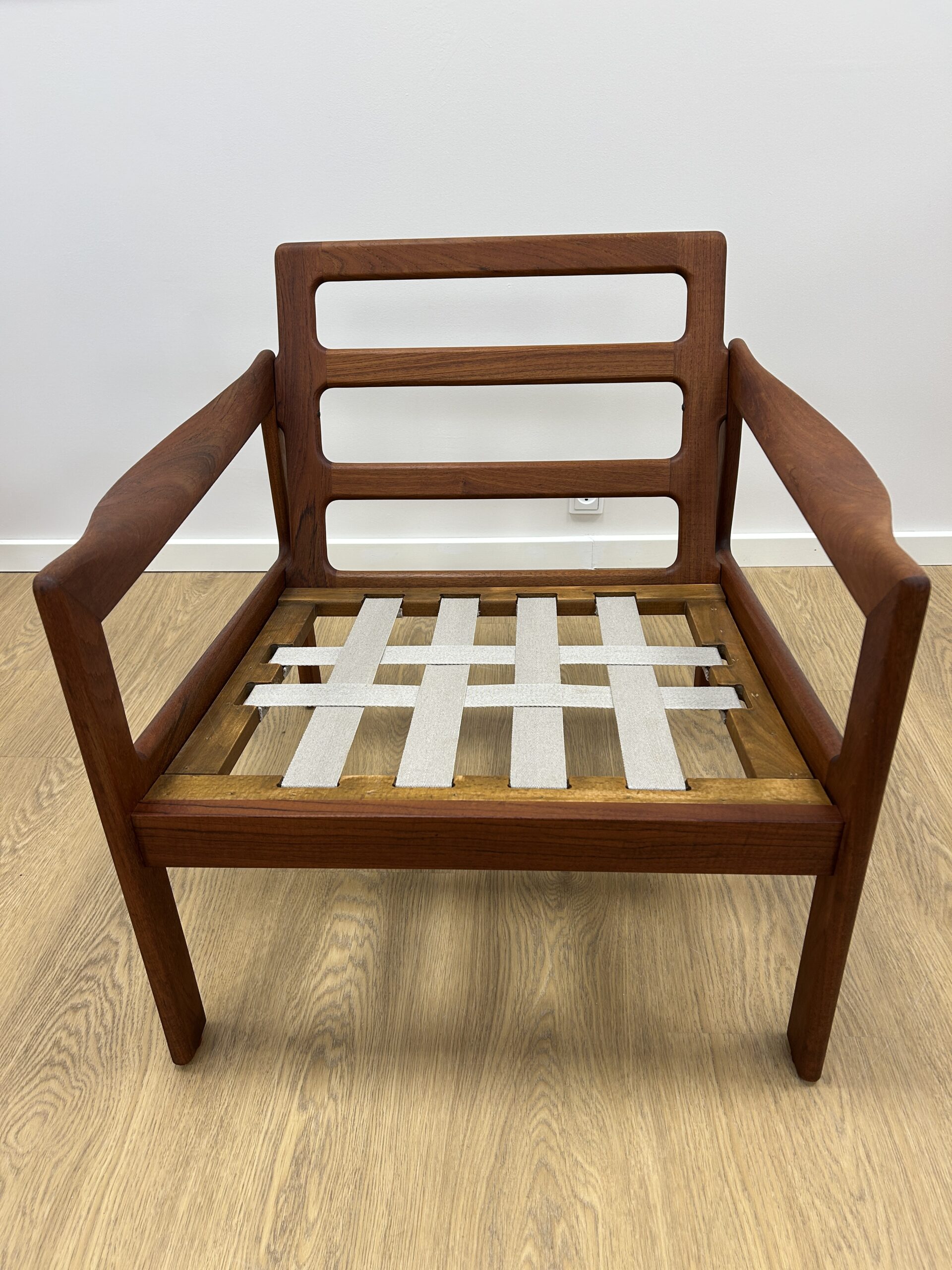 Stolen har gennemgået en grundig og nænsom renovering, hvor den har været skilt helt ad, renset, slebet og olieret, så teaktræets varme glød og struktur igen står flot og levende.
