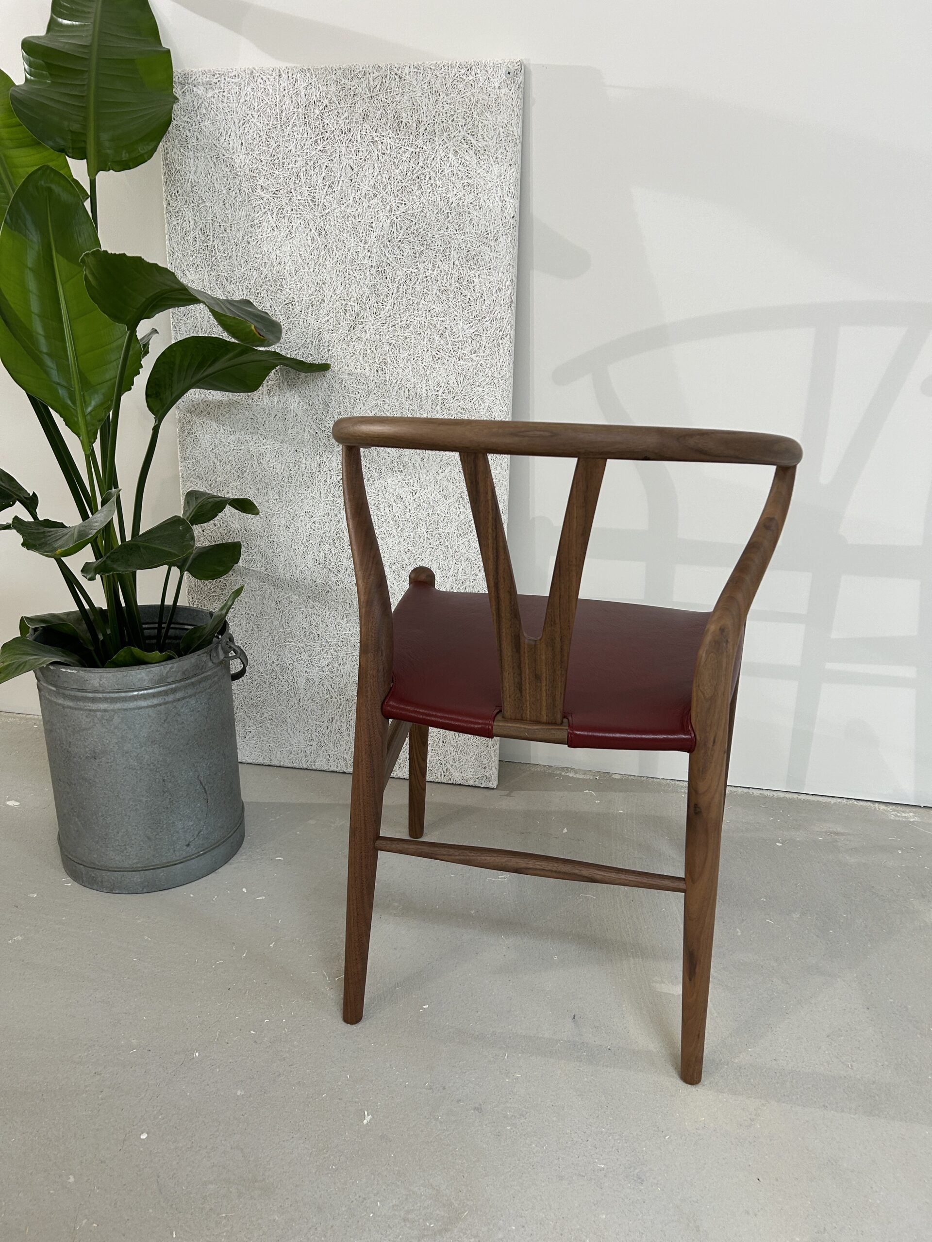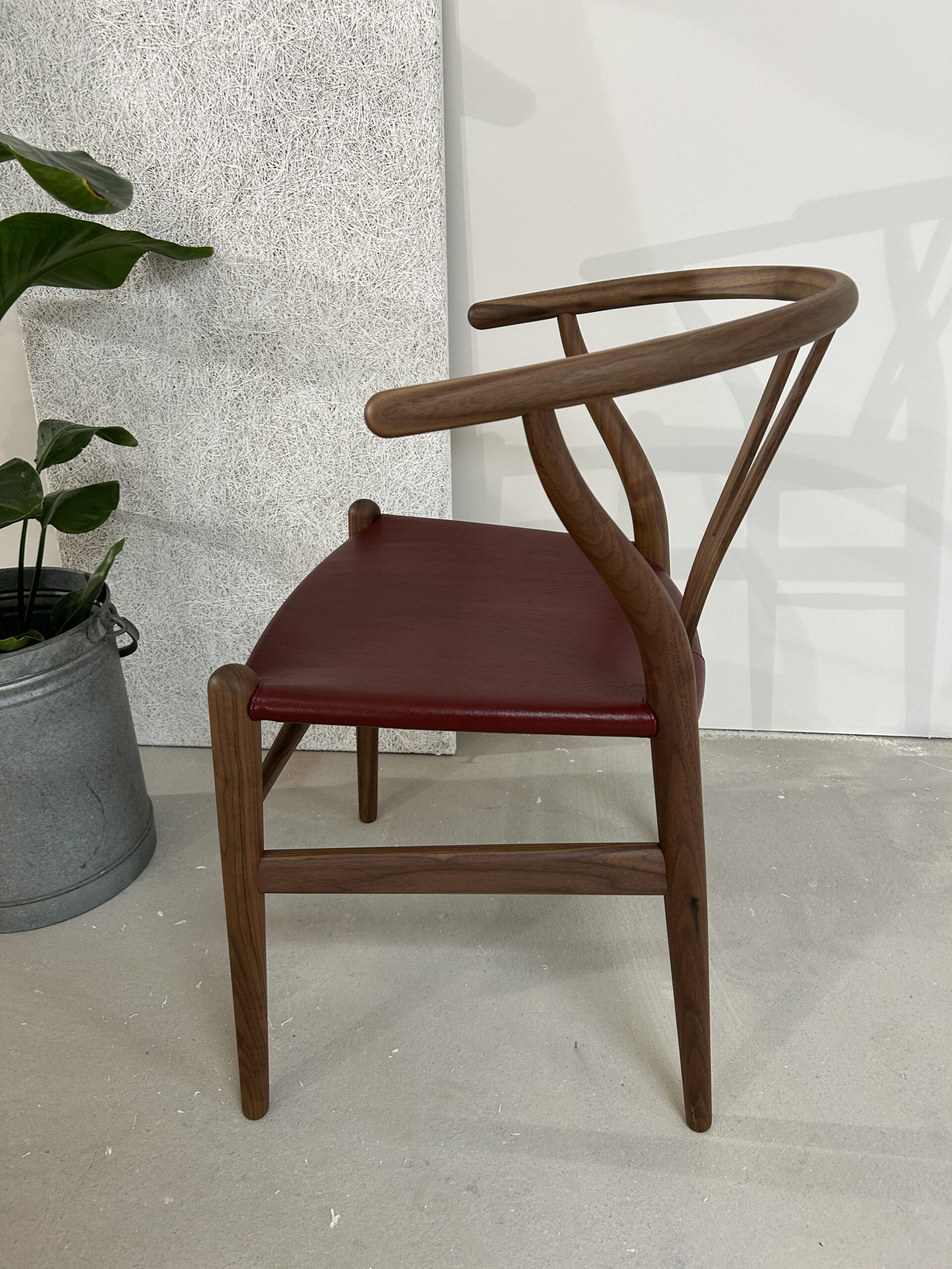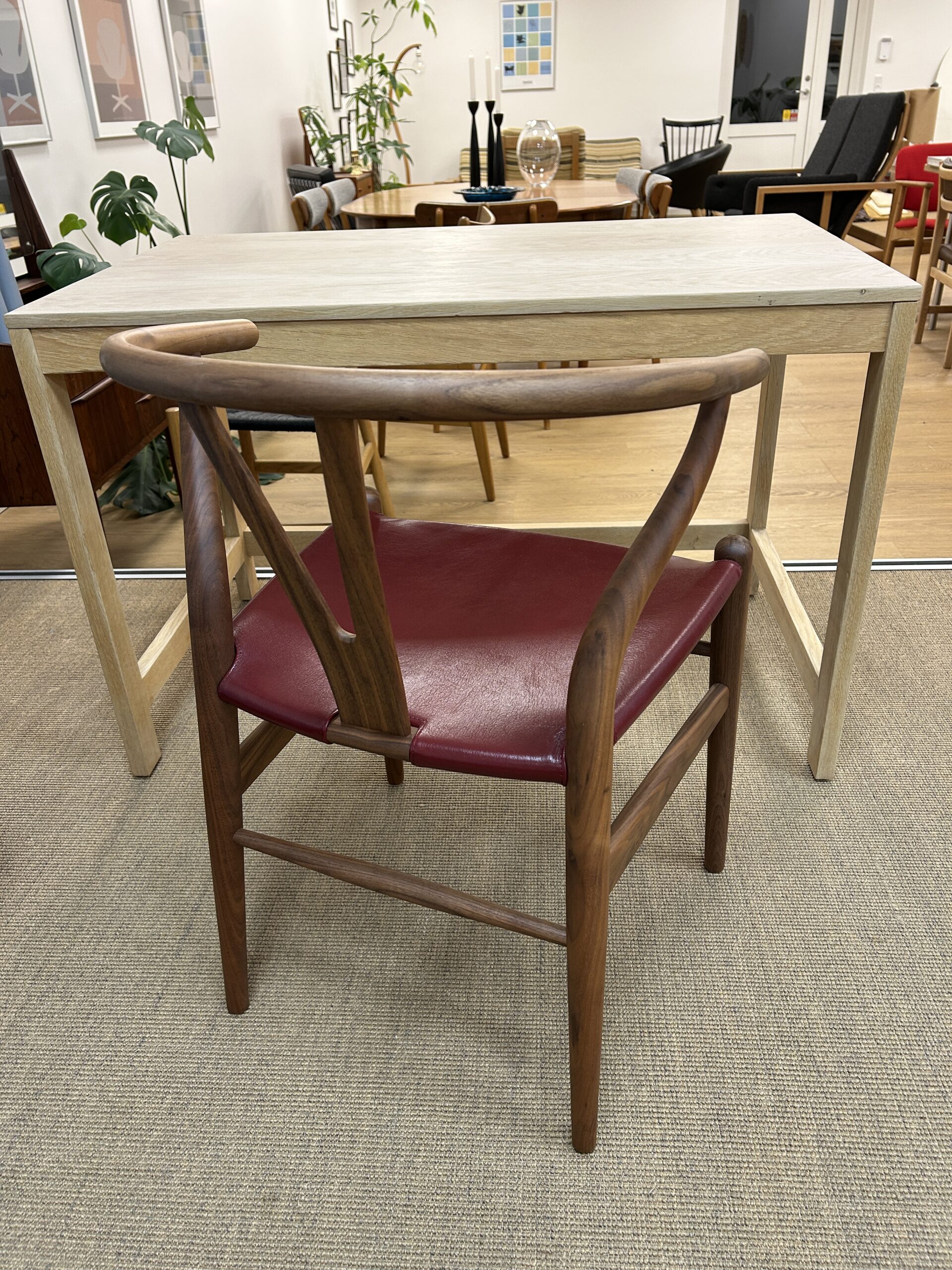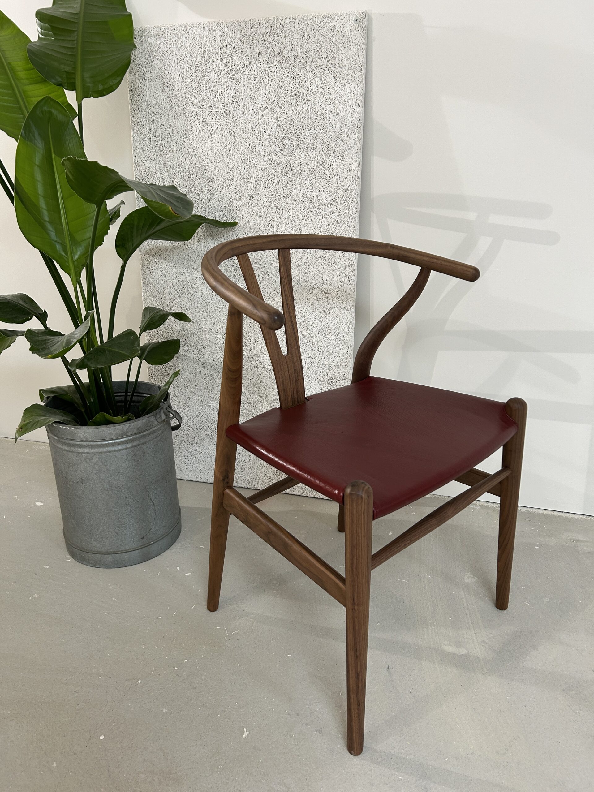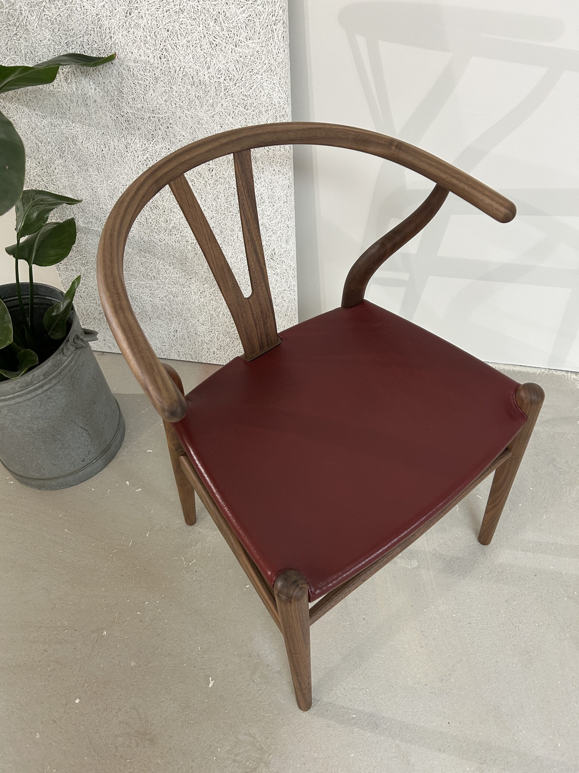 Oplev en sjælden og eksklusiv udgave af den ikoniske Y-stol (CH24) af Hans J. Wegner – designet med olieret valnøddetræ og et luksuriøst sæde i gedeskind.