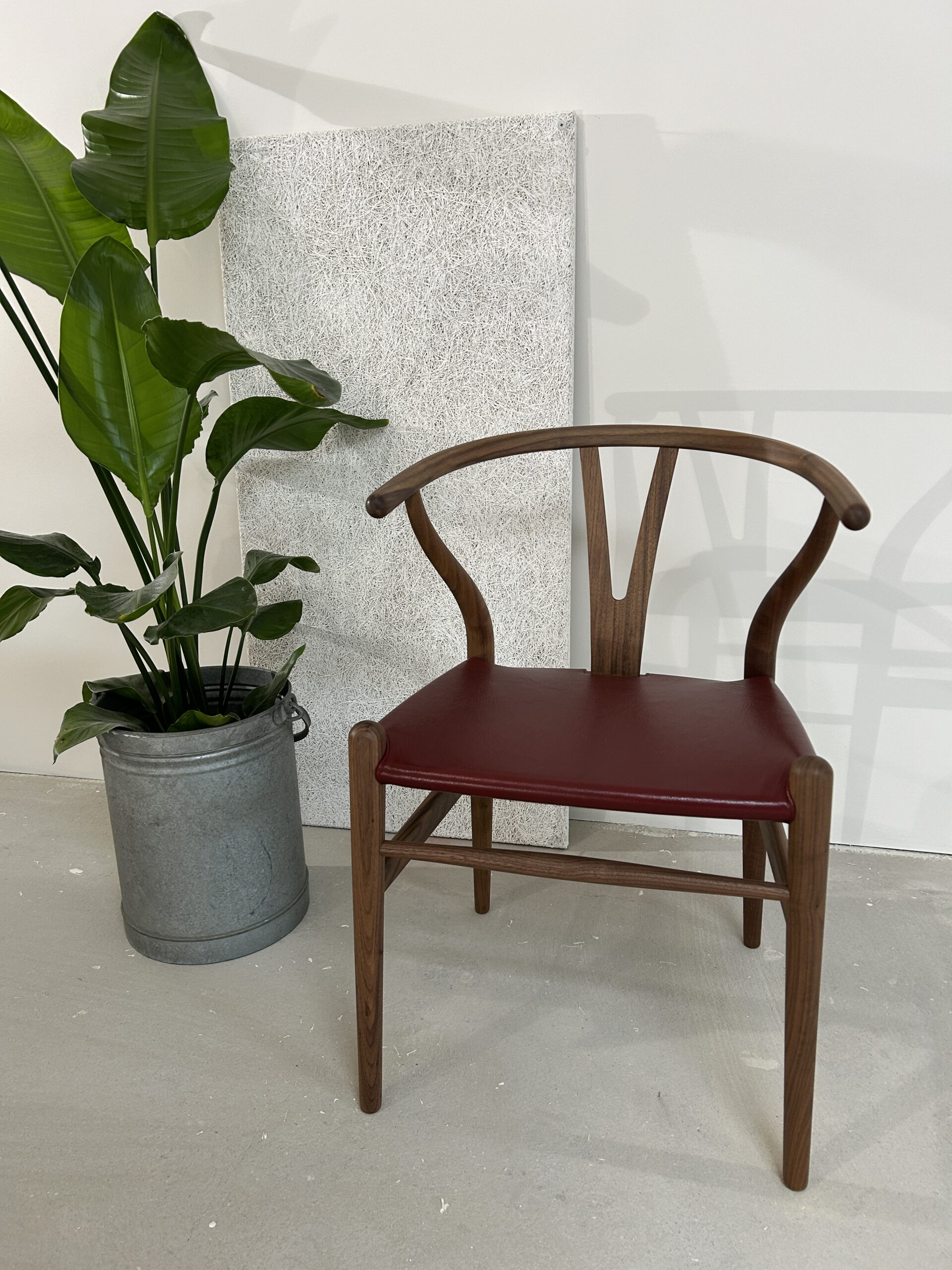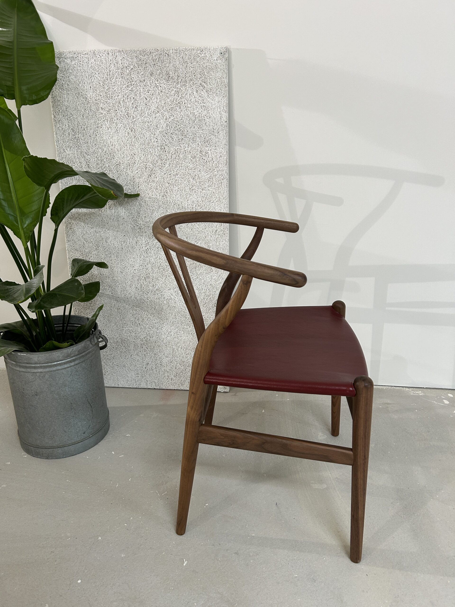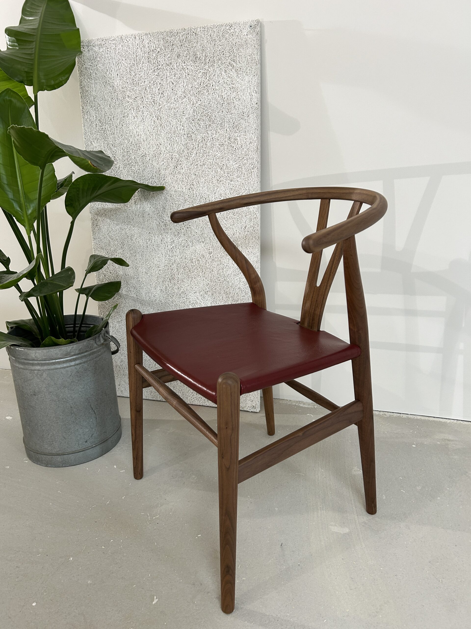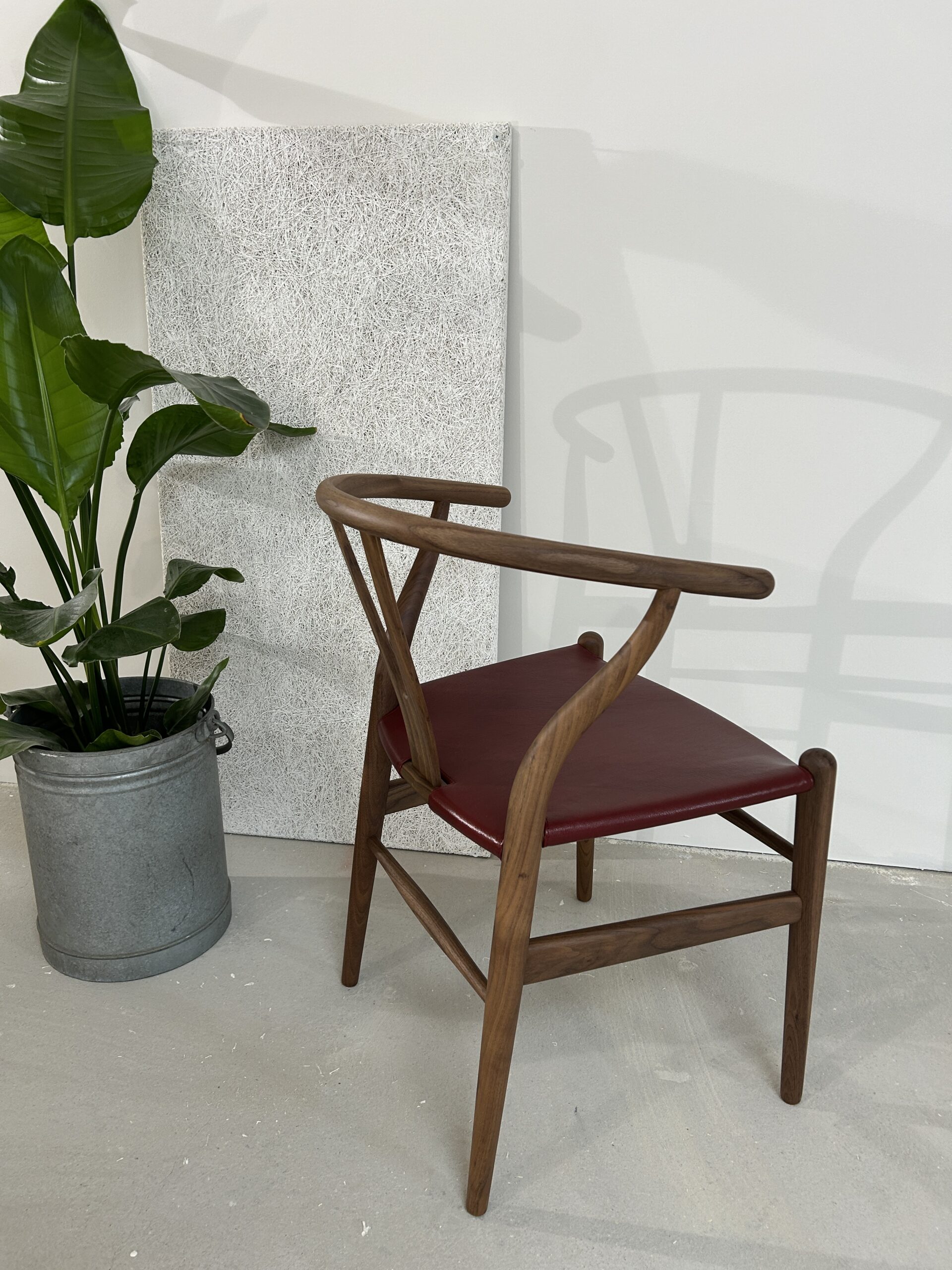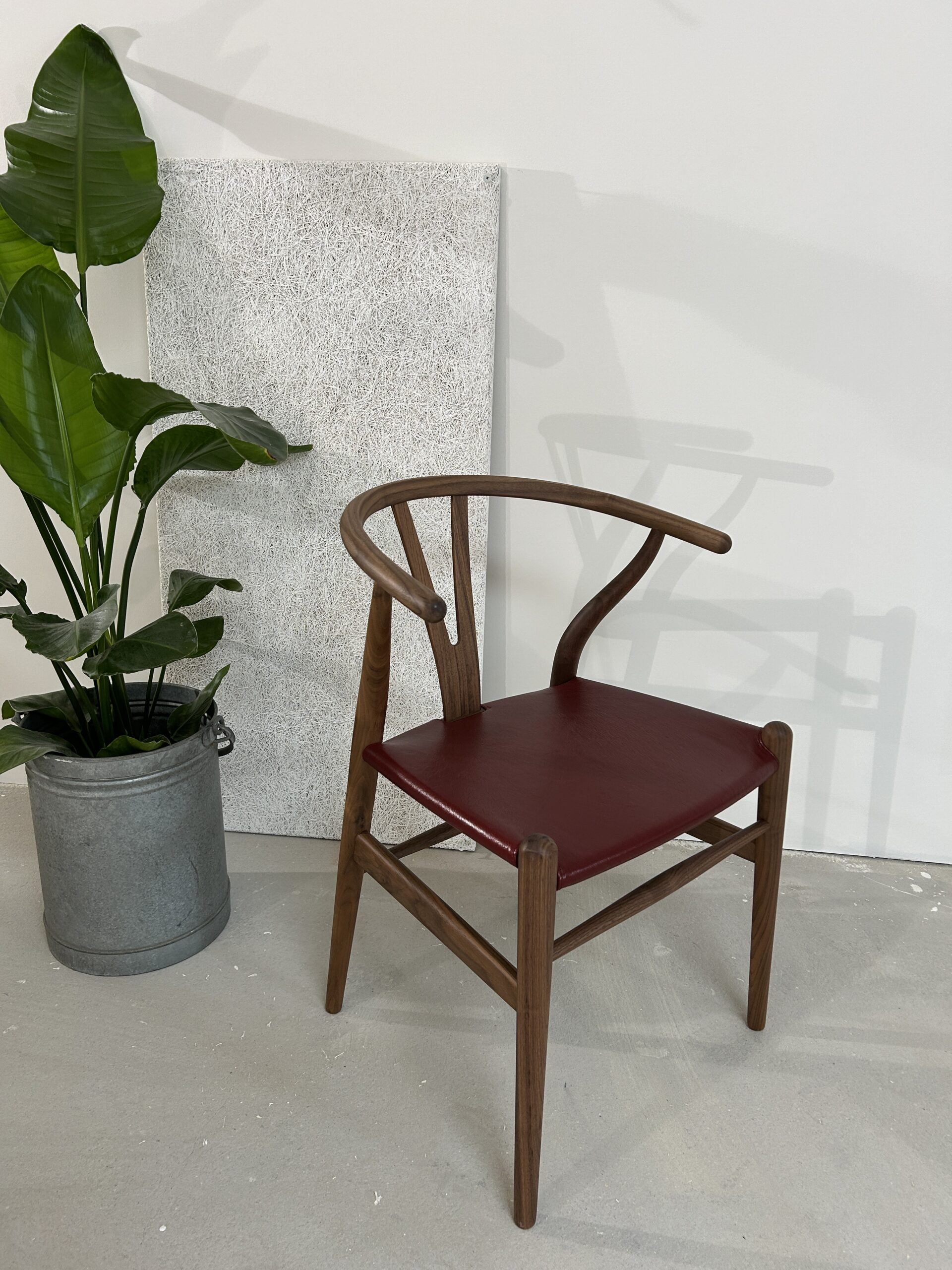 Oplev en sjælden og eksklusiv udgave af den ikoniske Y-stol (CH24) af Hans J. Wegner – designet med olieret valnøddetræ og et luksuriøst sæde i gedeskind.
